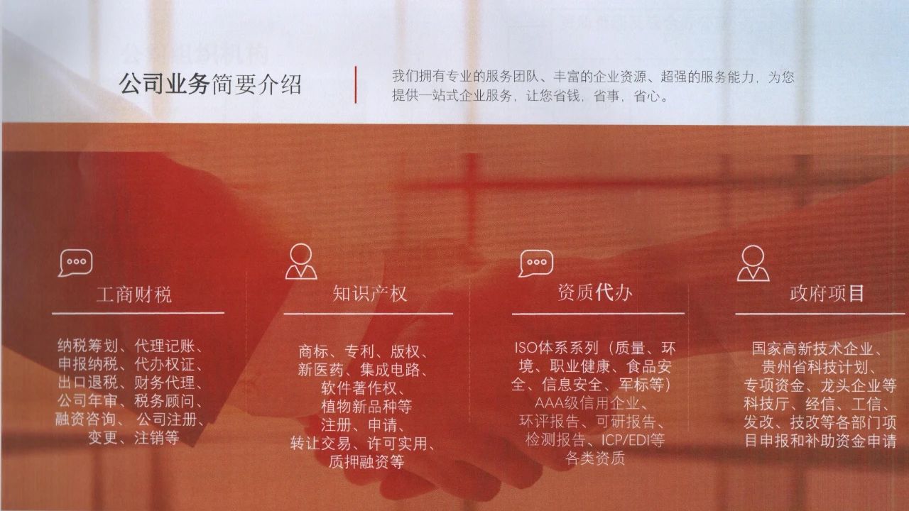 公司为广大客户企业发展提供全方位优质高效的服务,内容涵盖工商财税代理、知识产权保护、企业体系认证、各类资质和报告办理,以及国家高新技术企业、科技计划等政府补助资金申请与各部门项目申报等。
