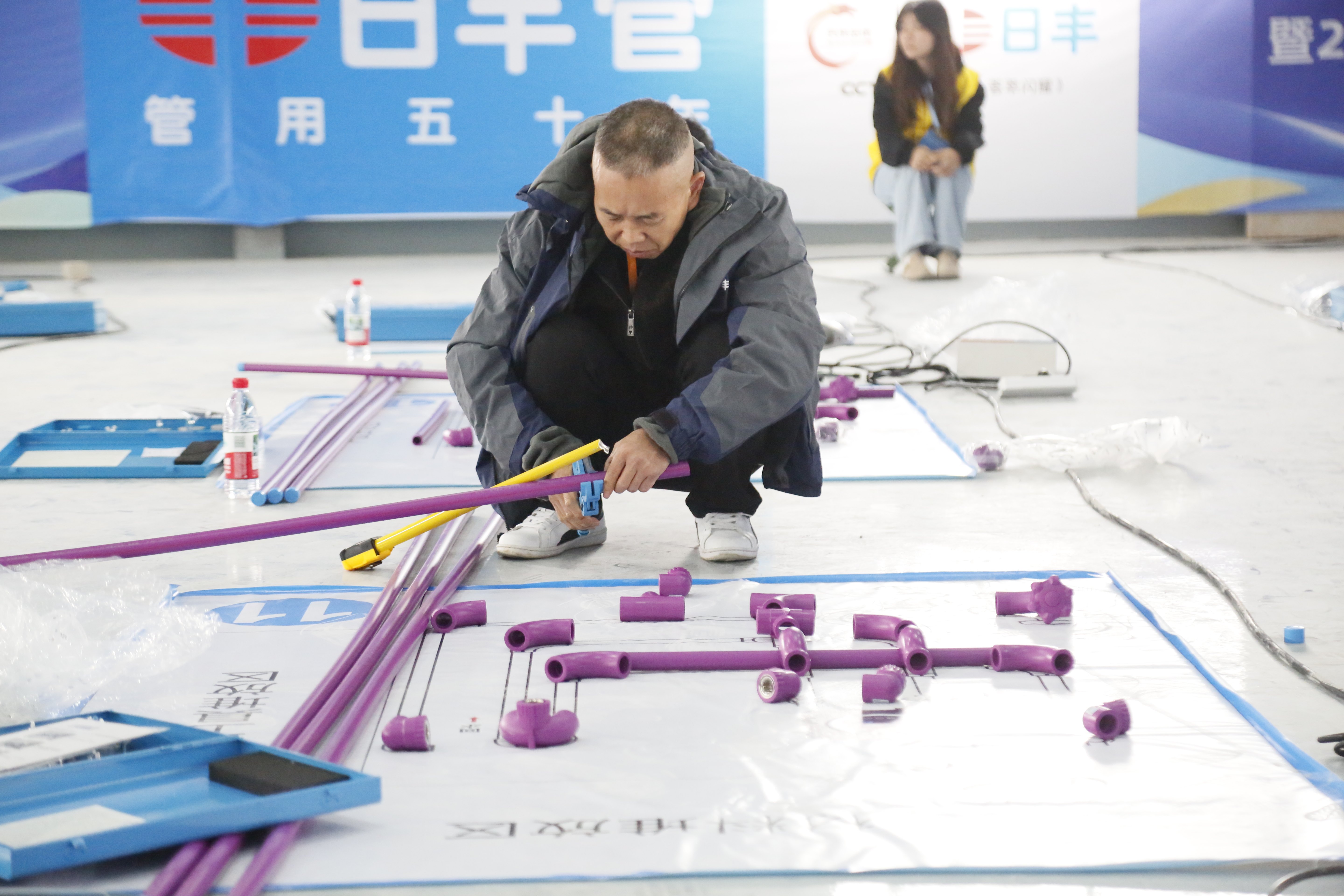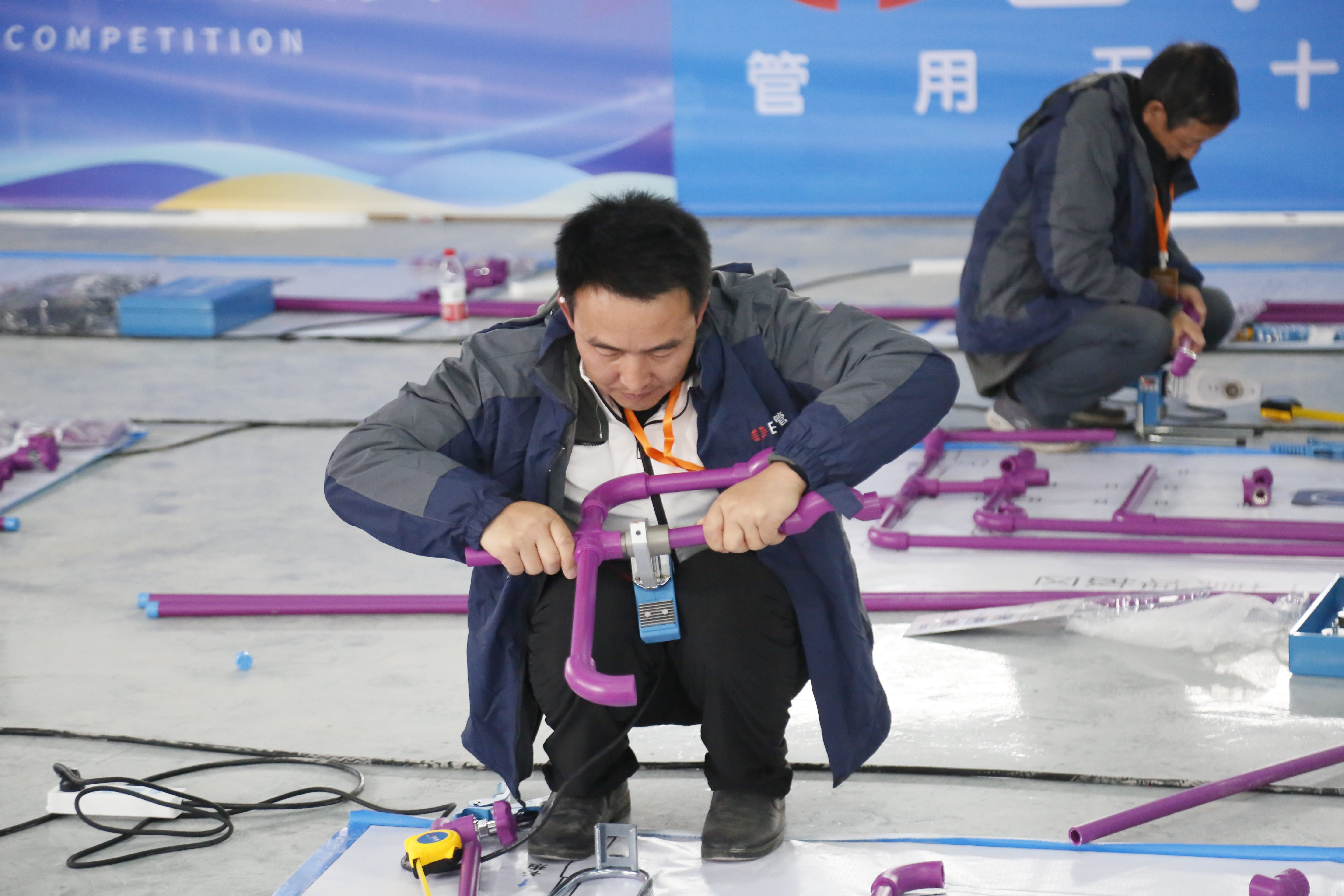 实操比武环节,18名参赛选手同场竞技。通过精准的安装技术、规范的操作流程和严格的质量标准,全面展示多维度管工实用技能。
