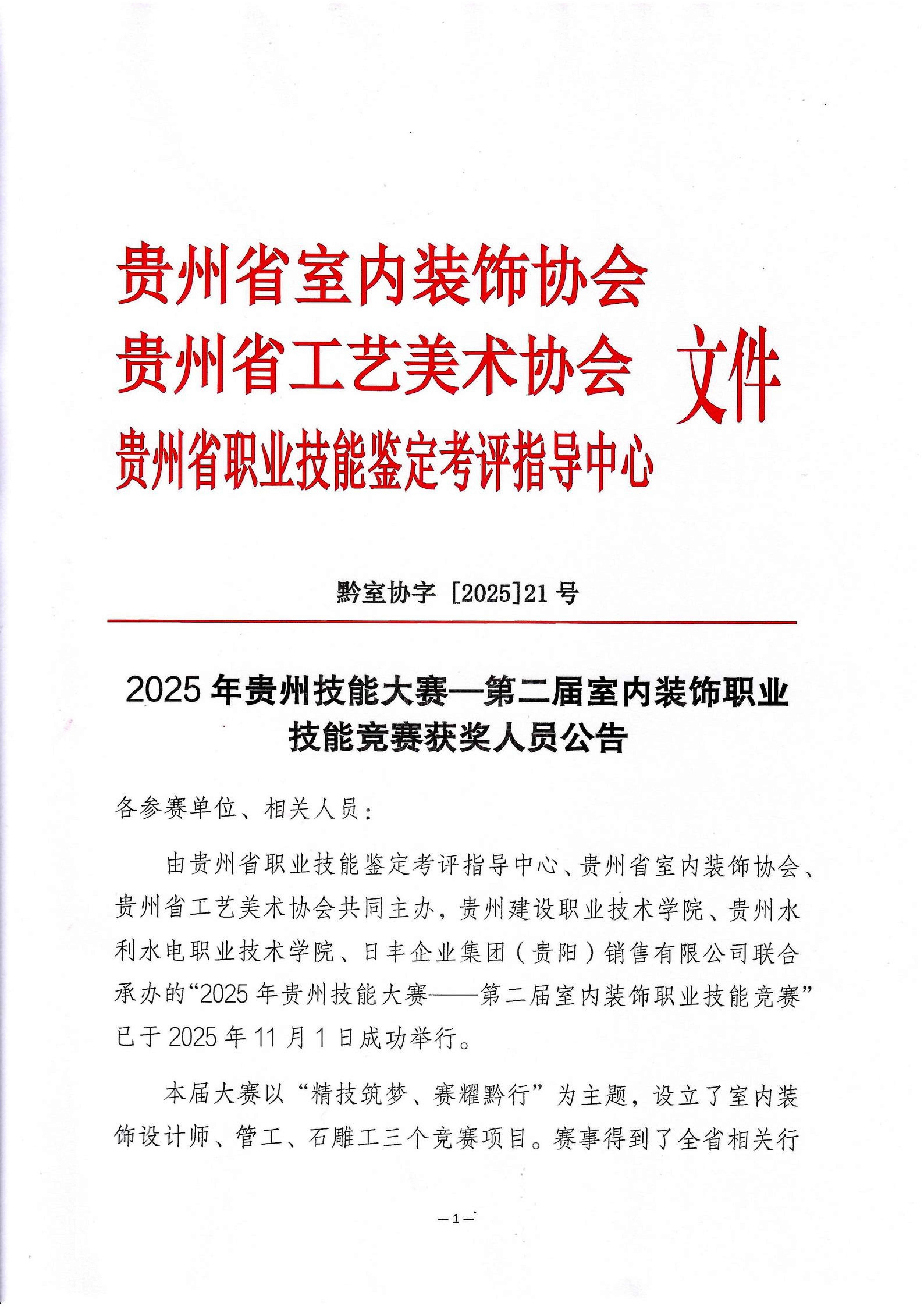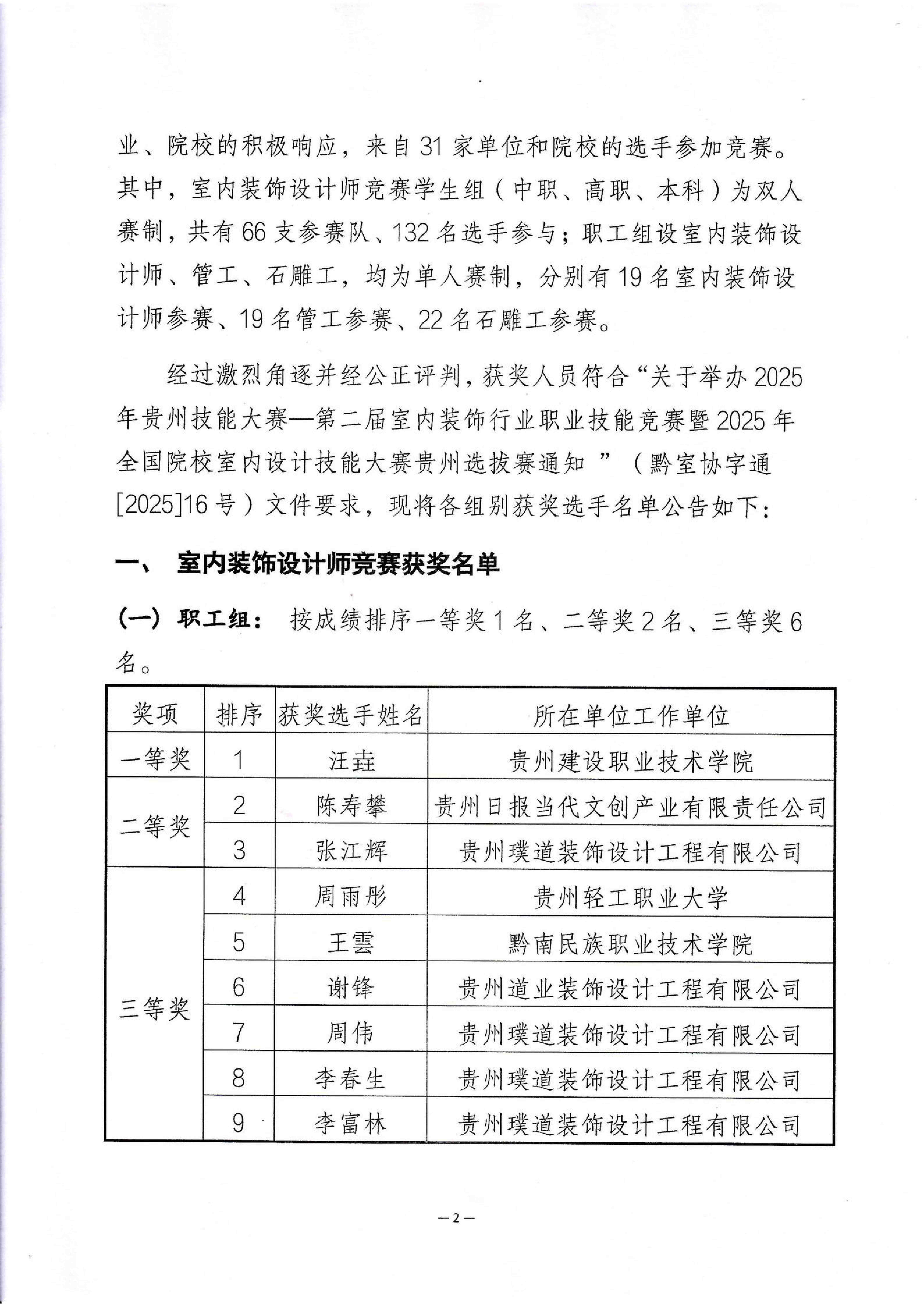 2025年贵州技能大赛-第二届室内装饰职业技能竟赛获奖人员公告