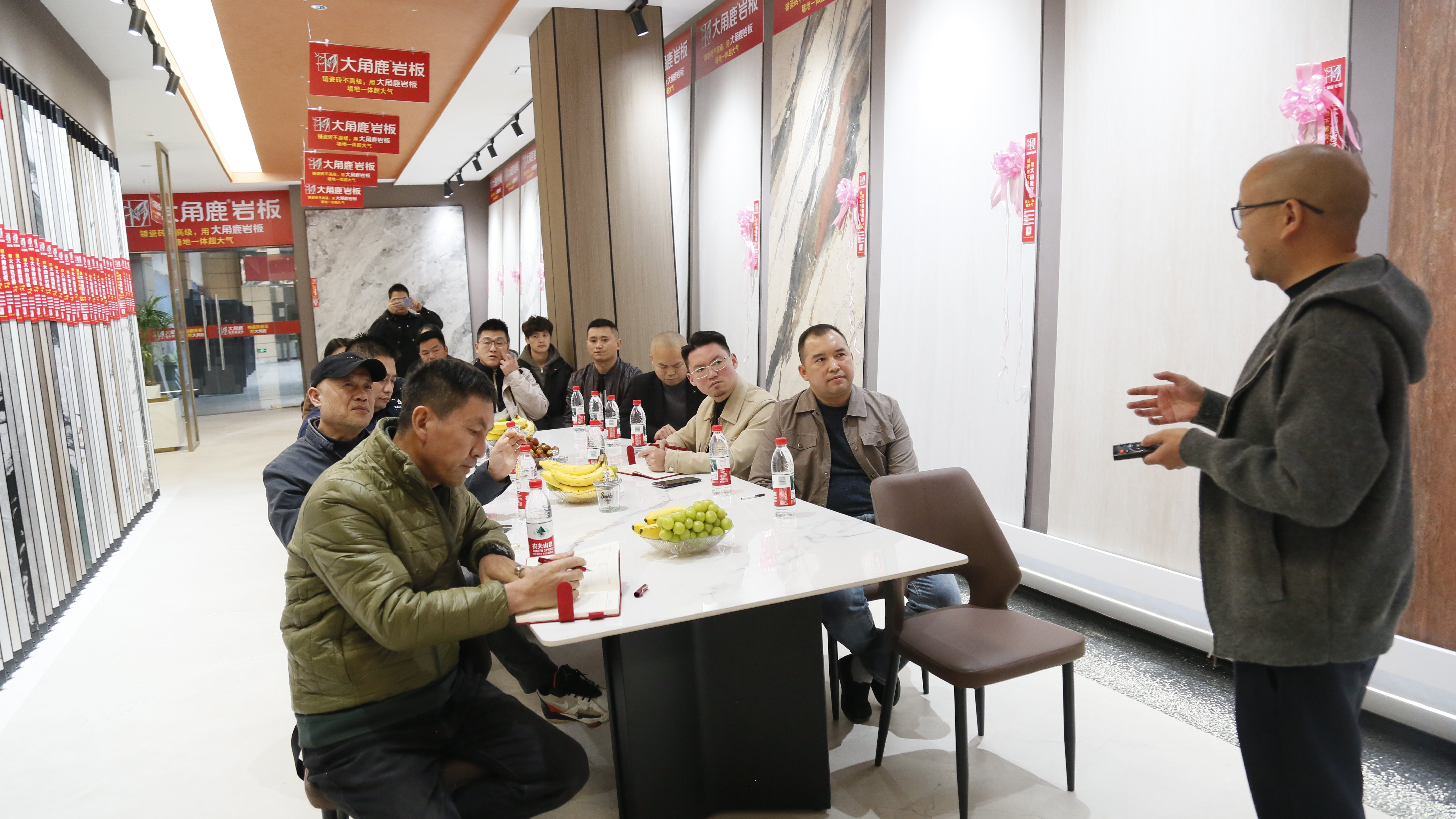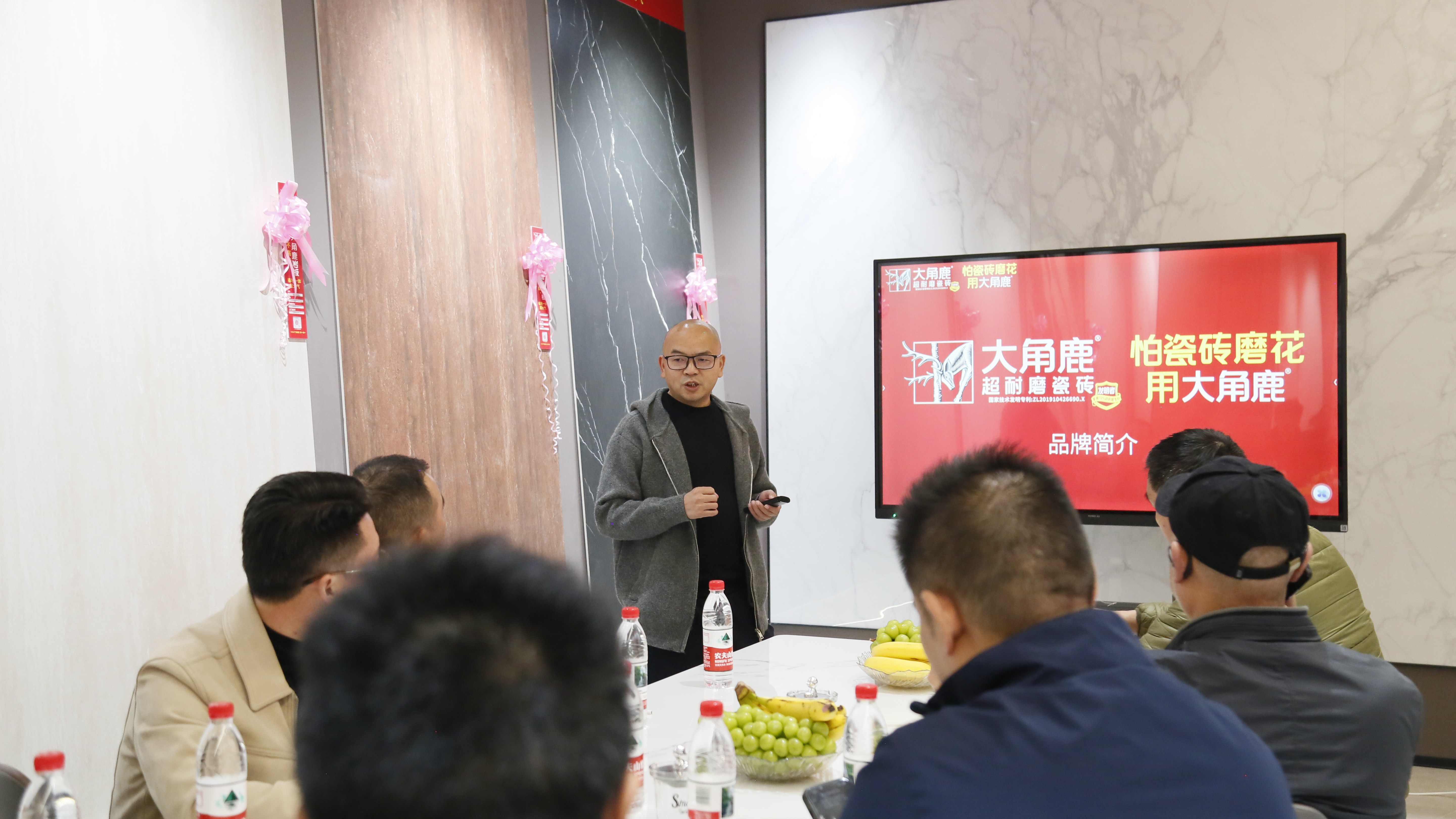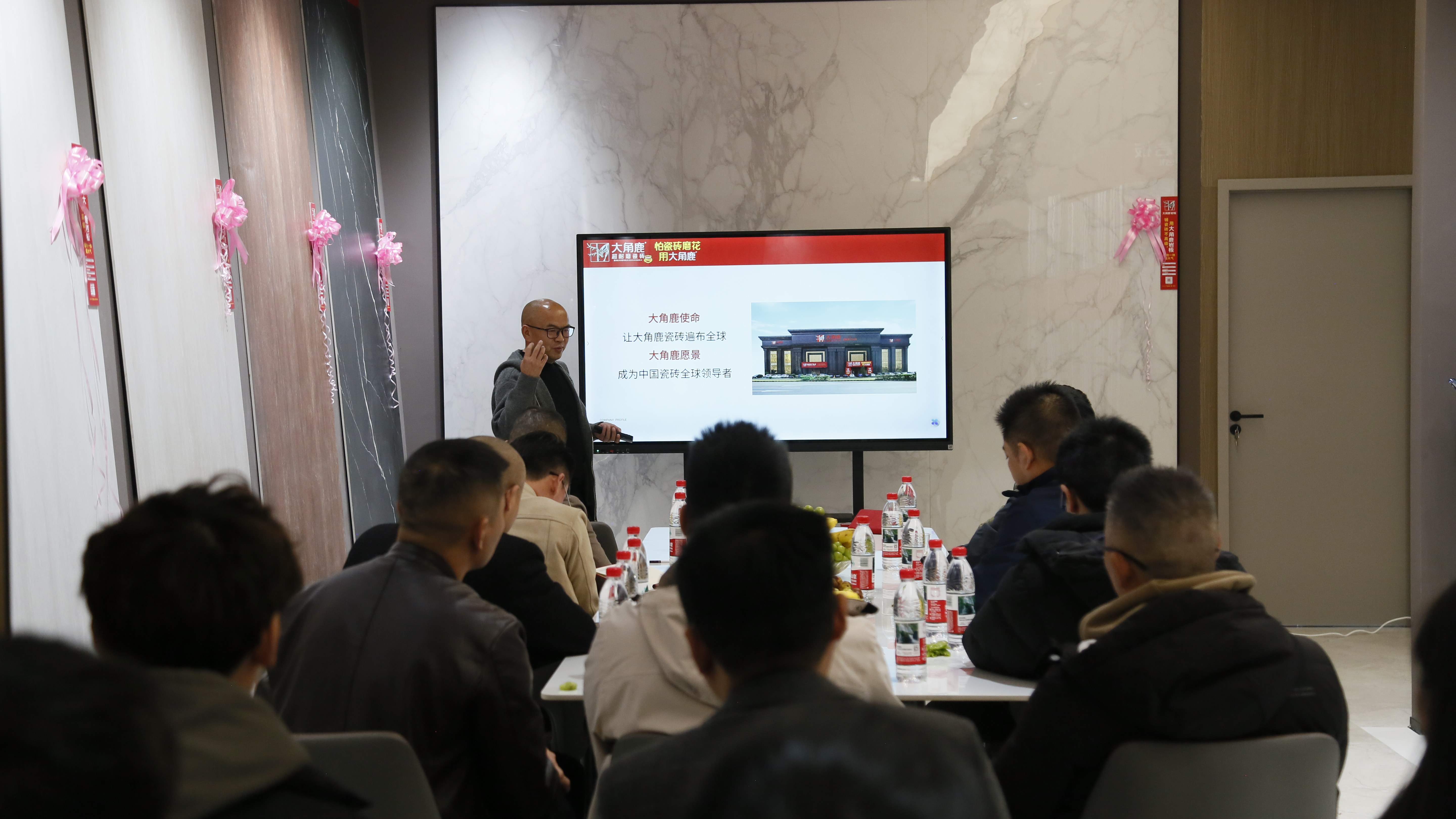 会议伊始,杨总通过PPT做品牌简介:“大角鹿”创建于2012年,前身是瓷砖行业知名品牌“金尊玉大理石瓷砖”。2019年1月1日,“金尊玉”通过企业战略升级,正式更名为“大角鹿超耐磨大理石瓷砖”,更具辨识度。