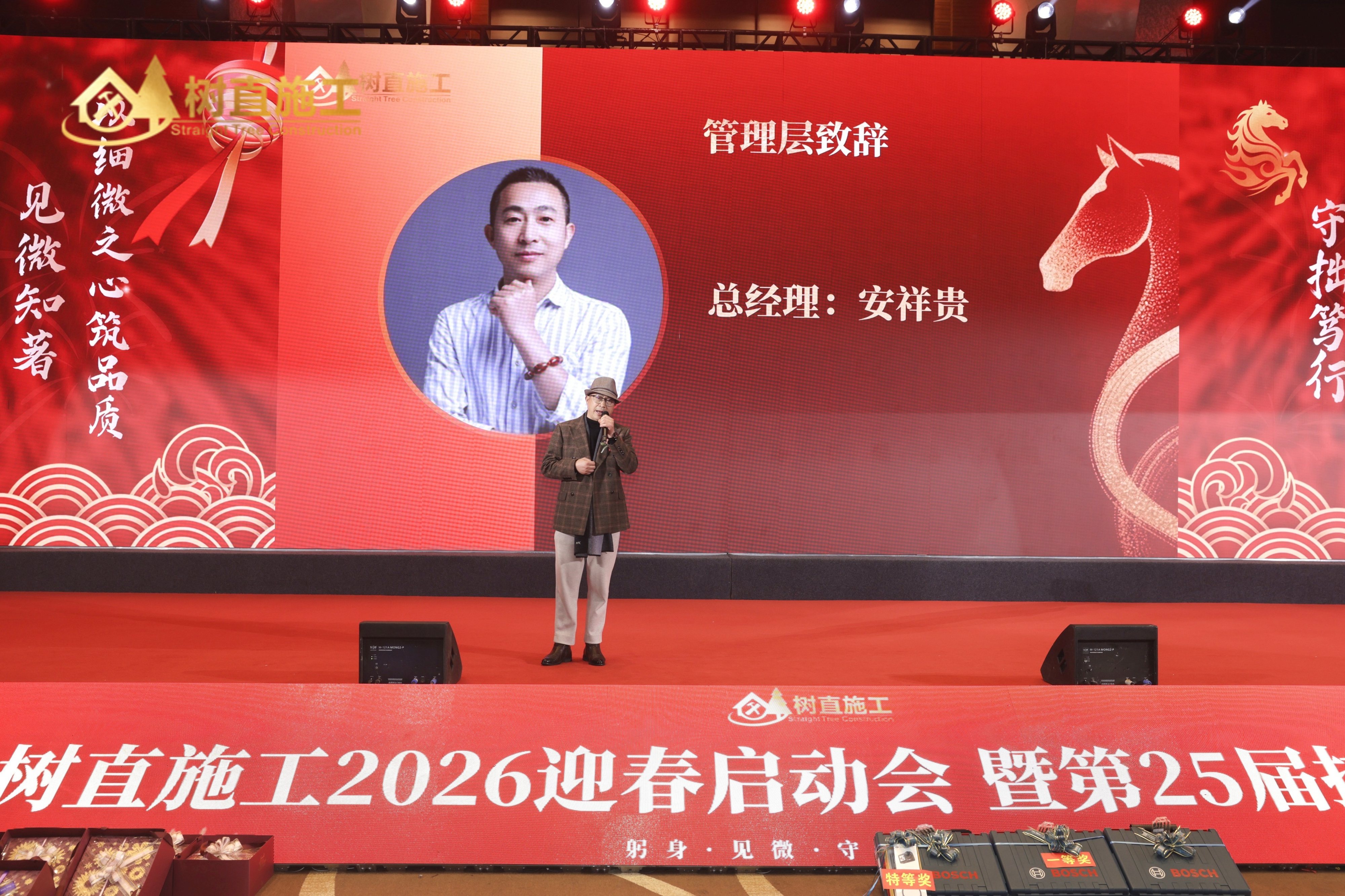 “装修这件事,说复杂也复杂,说简单也简单。就是把别人看不见的地方,当成自己的脸面来做。”树直施工创始人、总经理安祥贵发表致辞,用最朴实的语言讲述37年装修路,“新的一年,我们不搞花里胡哨的东西,就踏踏实实把每一个工地干好。”