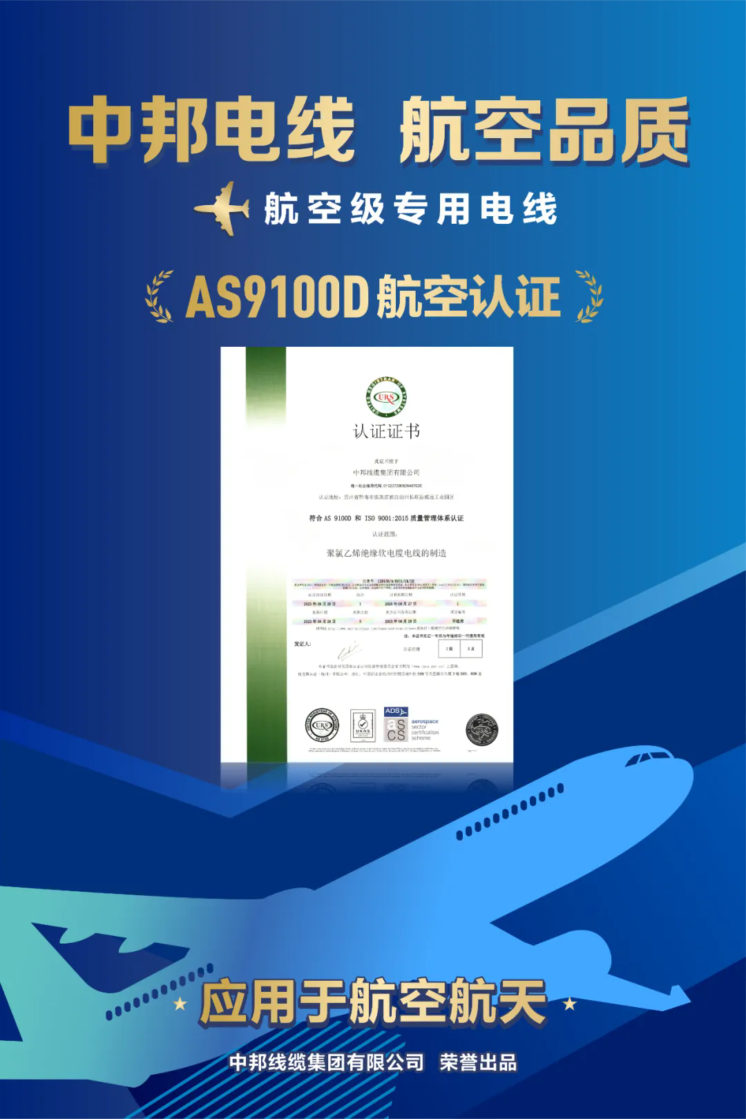 2023年10月,中邦线缆集团成功通过《AS9100D航空质量管理体系认证》,成为西南地区唯一获此认证的企业,彰显了其在产品质量管控和制造工艺上的雄厚实力与高标准要求。