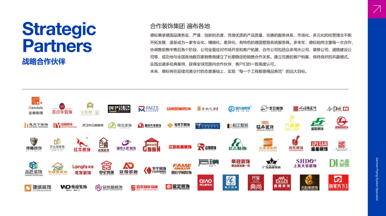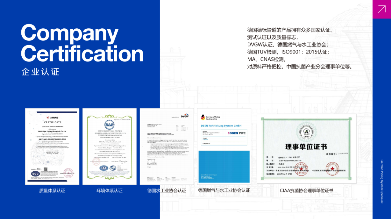 德标管道源自德国,是一家专业生产高科技塑料管道系统的独资企业。公司始终秉承全球一流企业的发展方向,以质量求生存,以诚信谋未来,致力于研发具有自主知识产权的高新技术绿色环保塑料管道,经过多年不断开拓市场,企业规模迅速发展壮大,拥有国际领先的生产流水线和检测设备,严格按照国际标准组织生产,从原材料购进到产品出库实行全程控制,产品结构日趋多元化。