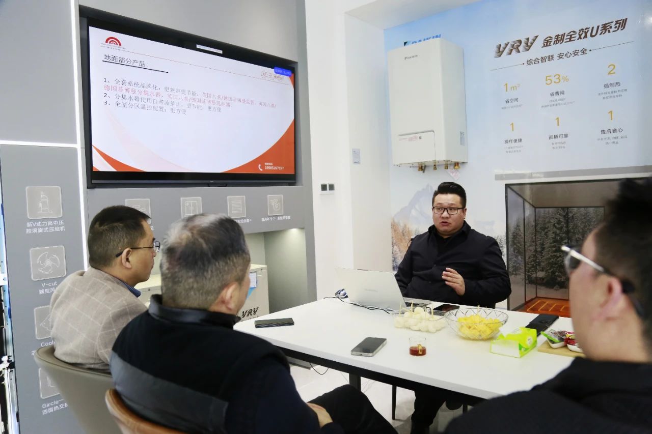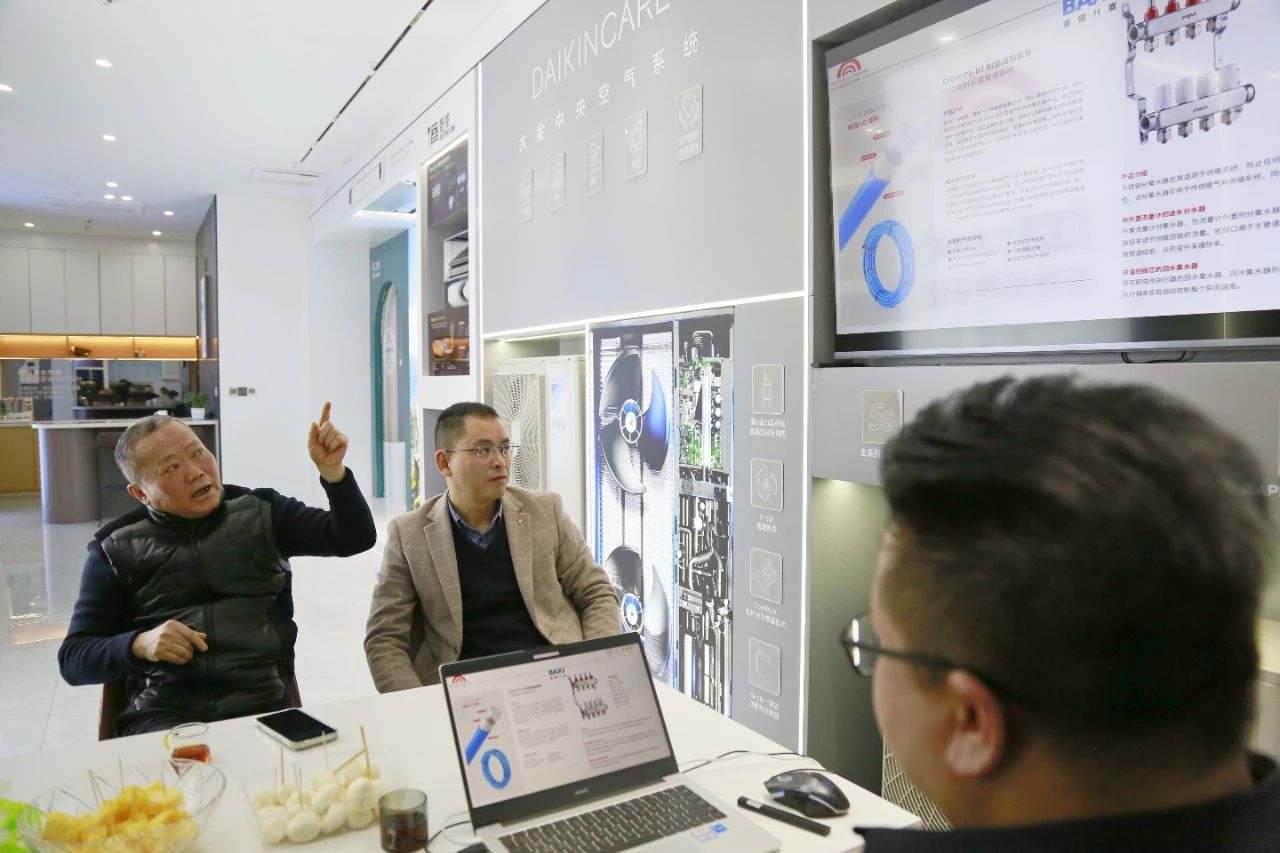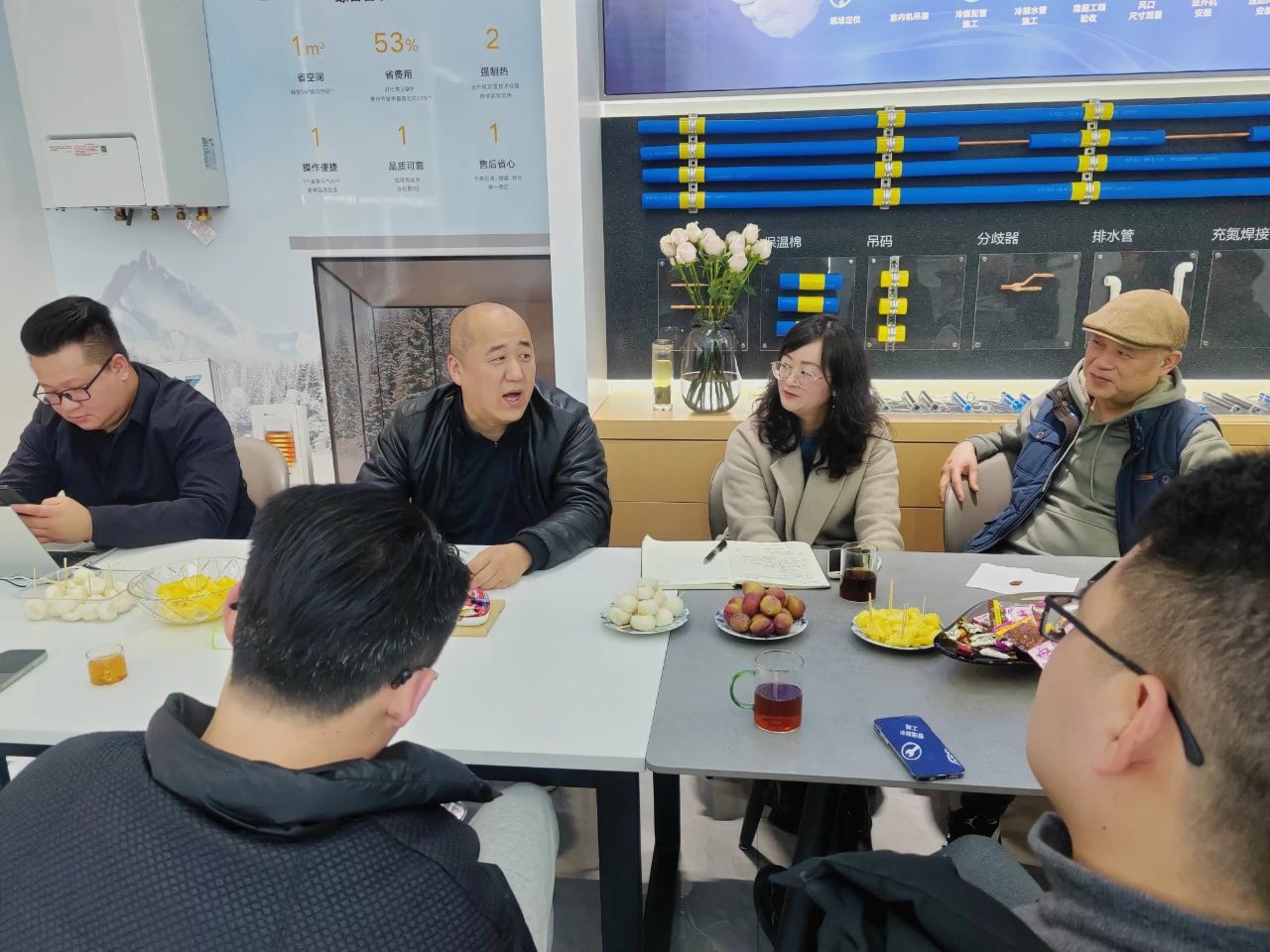 暖洋洋销售总监毛荣涛首先通过PPT向调研组详细展示了企业概况、旗下品牌、优势与工艺。公司创始人夏斌在随后的发言中表示,为适应市场变化,企业灵活调整策略——一是紧扣市场需求扩充升级品类以增强竞争力,同时积极拓展门店;二是为保障施工质量,解决同行痛点,单独成立施工工程公司,此公司拥有国家科技部颁发的奖项,具有强大的技术优势;三是面向全省批发,向经销商传递技术与经营理念;下一步,暖洋洋还计划成立售后服务公司,以实现产品全生命周期管理。红星二店兼大金空调门店负责人赵永平、渠道销售经理王璐也表示,虽然加入公司时间不长,但都很看好暖通行业的发展前景,以往行业龙头企业方向发展为愿景。