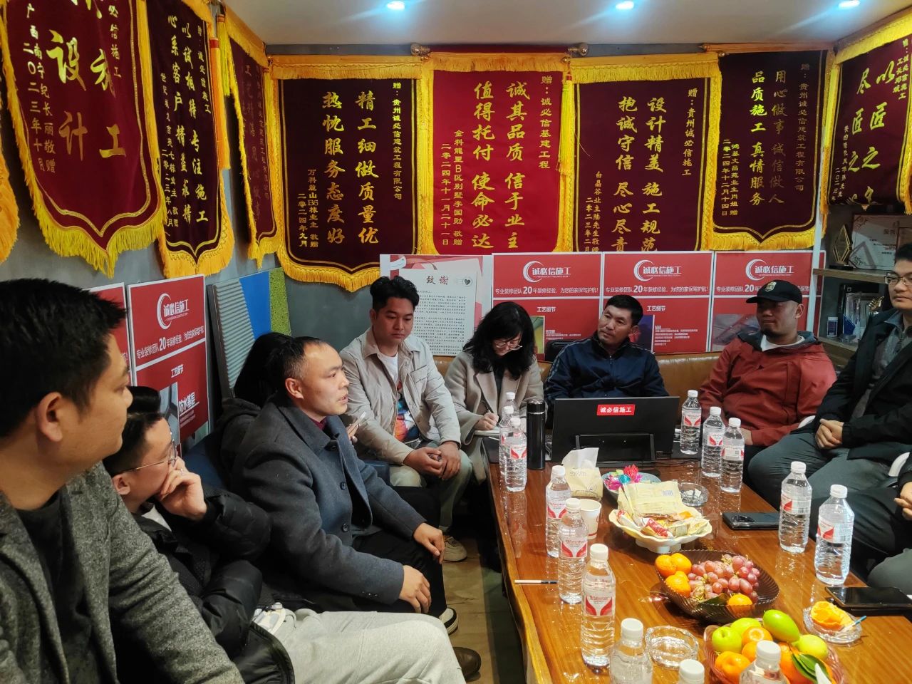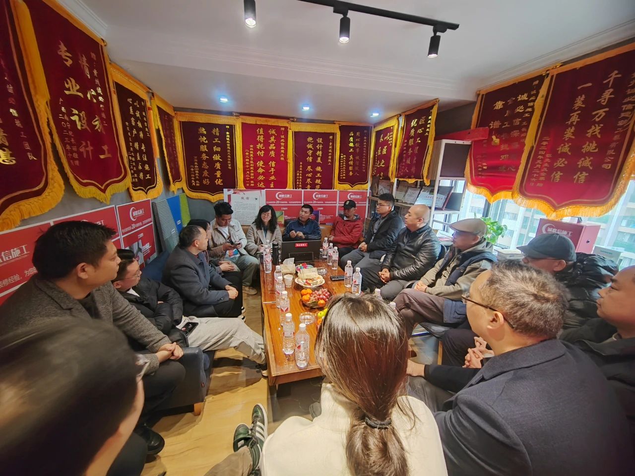 高磊会长、杨波副会长、甘剑琪副会长等协会领导及与会的各会员企业代表对诚必信取得的优异成绩表示祝贺,满墙的锦旗就是对企业最好的赞誉。在热烈的氛围中,大家各抒己见,对施工类企业打造“订单班”的可行性、协会组织进工地考察活动、施工工艺拆分细化的优势与弊端、机械化在工装与家装中的应用等问题进行探讨。