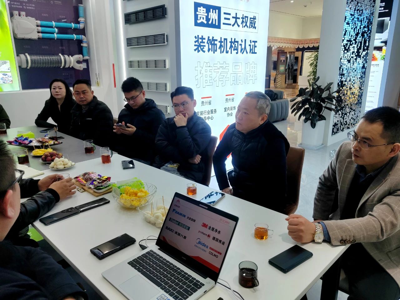 3月19日,协会会长高磊率副会长杨波、甘剑琪,执行秘书长张建刚,常务理事钟世伟,理事白兵、廖毅、叶进,副会长单位日丰企业集团(贵阳)销售有限公司家装渠道经理李方龙、副会长单位固达电线电缆(集团)有限公司家装渠道负责人李金超、副会长单位泰山石膏有限公司贵州区域负责人赵岩、副会长单位贵州工业职业技术学院建筑工程系主任王勉、常务理事单位贵州鹰牌科技有限公司(华鹏瓷砖)代表毛念,以及贵州兴启杨建材有限公司总经理王国伟一行十余人,分别走进贵州暖洋洋暖通设备工程有限公司、贵州德标管业有限公司、贵州诚必信建筑工程有限公司,面对面交流,零距离问企。暖洋洋公司创始人夏斌、销售总监毛荣涛、红星二店兼大金空调门店负责人赵永平、渠道销售经理王璐,德标管业贵州分公司总经理贺义波、运营总监张永胜、家装渠道经理卢超、涂料运营总监龙丽,诚必信公司总经理付堂友及合伙人李恒对调研组的到访表示热烈欢迎。