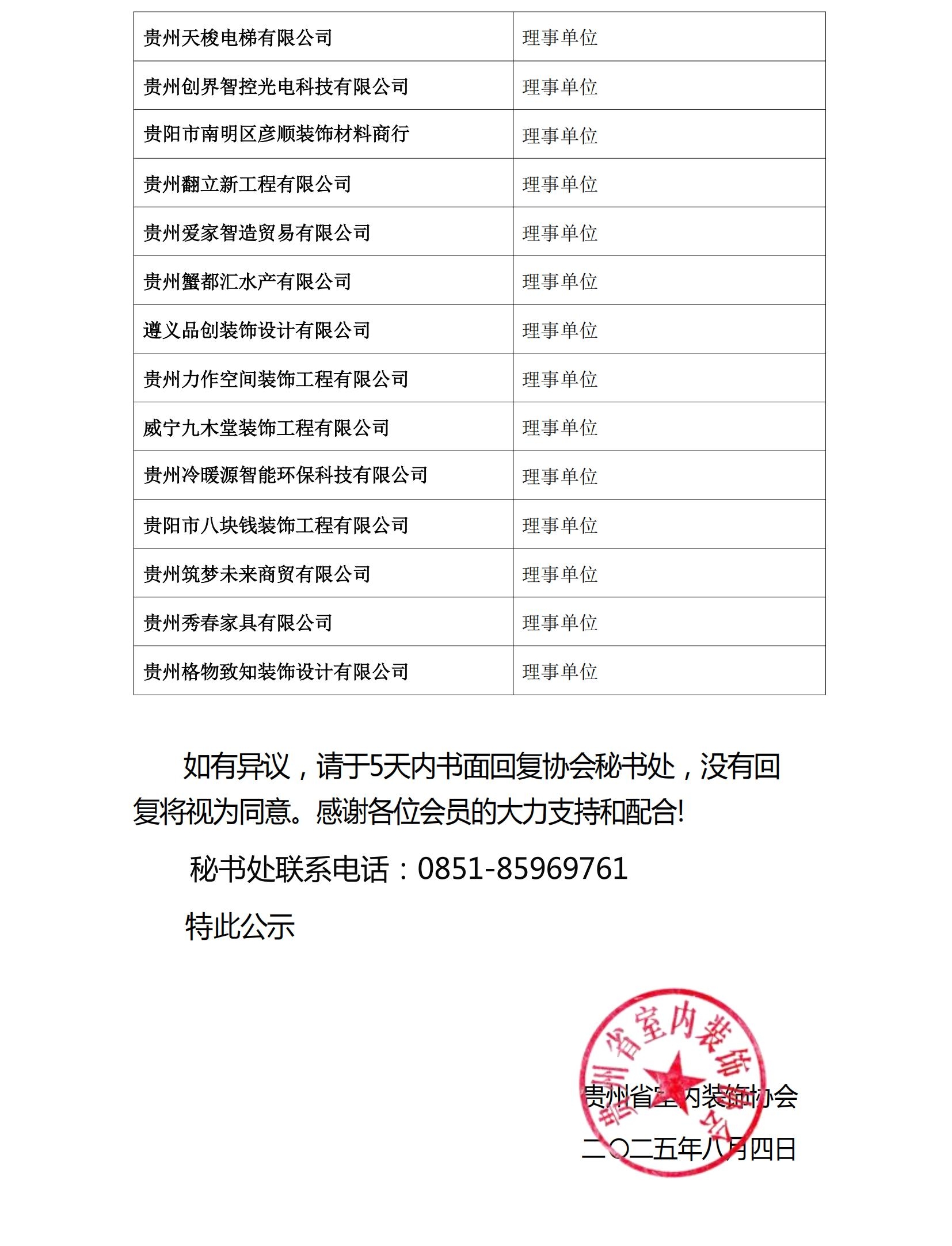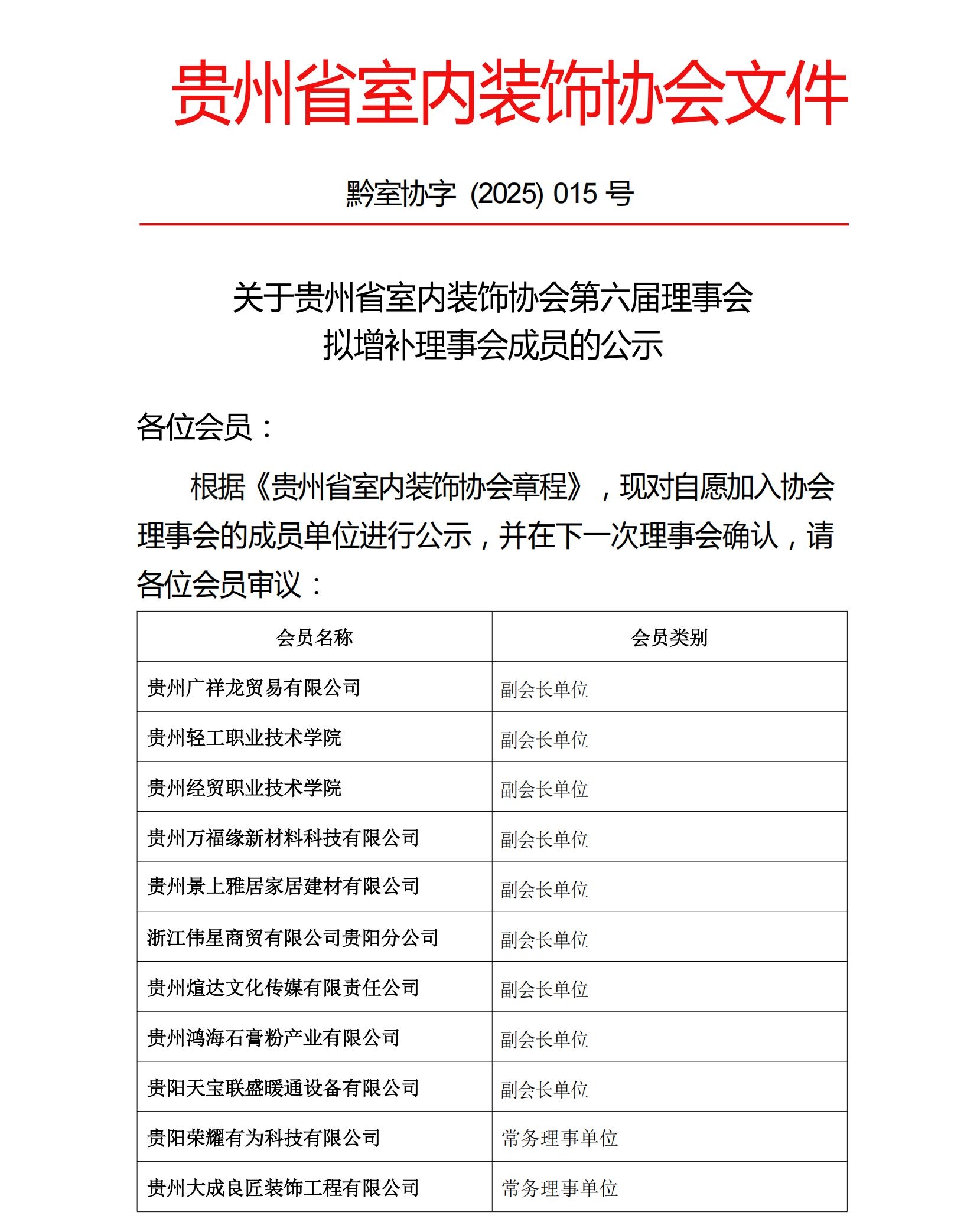 关于贵州省室内装饰协会第六届理事会拟增补理事会成员的公示
