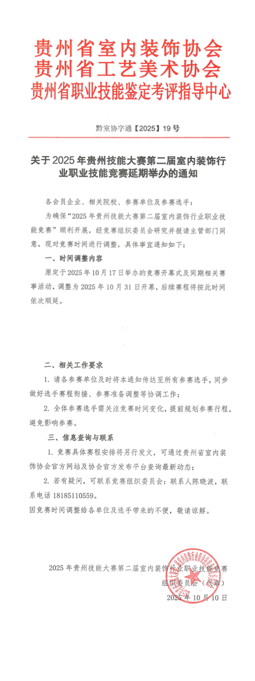 关于2025年贵州技能大赛第二届室内装饰行业职业技能竞赛延期举办的通知