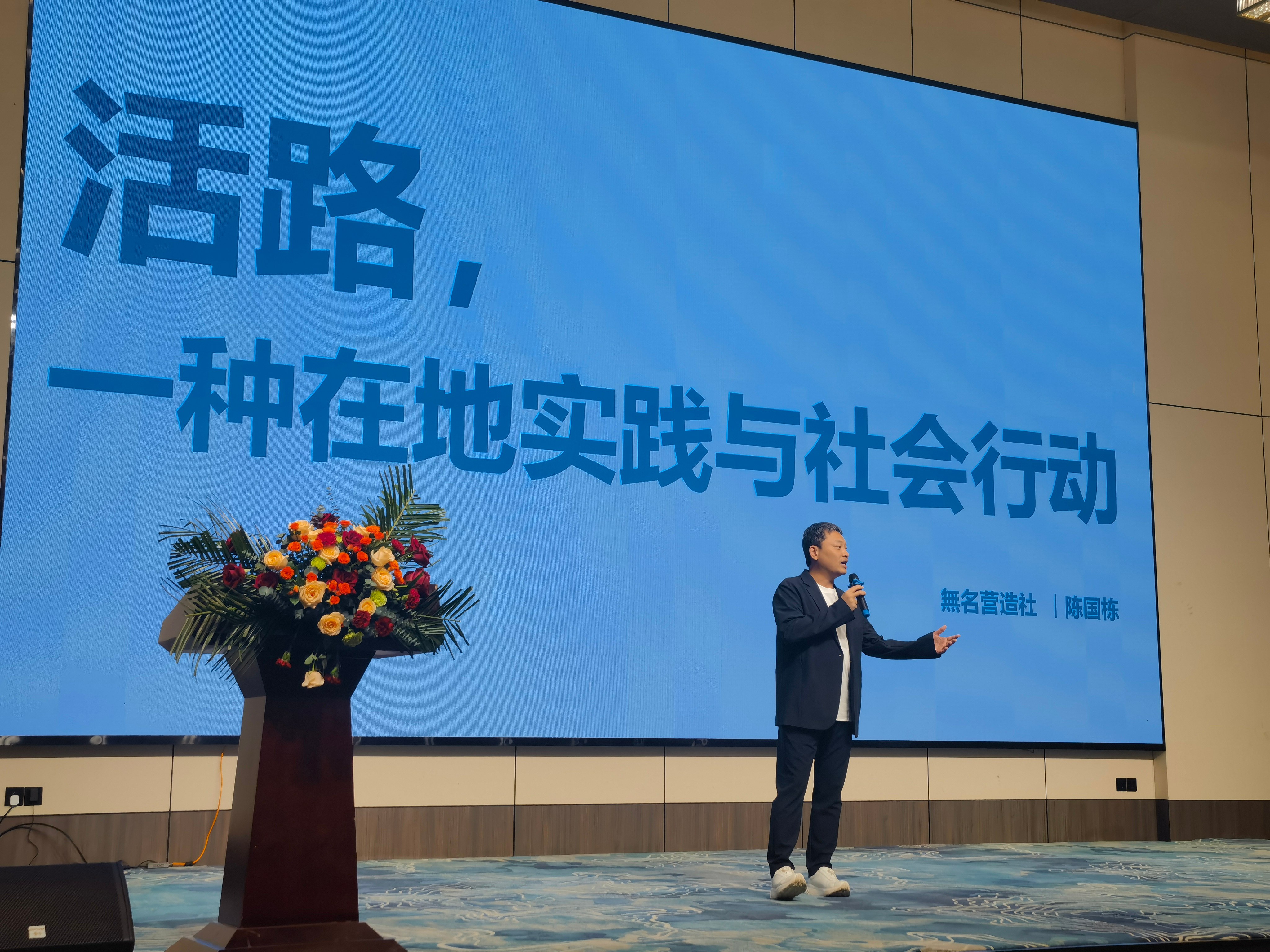 活动下半程,重磅嘉宾陆续登台,现场气氛更加高涨。無名营造创始人陈国栋以“活路,一种在地实践与社会行动”为主题进行精彩分享。作为海归建筑师,他长期致力于乡村建筑实践,尤其在贵州黔东南和广东开平塘口镇的改造项目中,通过新旧融合的设计理念推动乡村可持续发展。在他看来,乡村的建筑营造不仅是物质空间的建造,更是融入环境、接地气的社会实践。